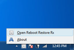 بعند إعادة تشغيل الجهاز ستجد ايقونة البرنامج بجانب الساعة إضغط عليها بزر الفأرة الأيمن ثم Close Reboot Restore Rx لإيقاف البرنامج أو Open Reboot Restore Rx لتشغيله.