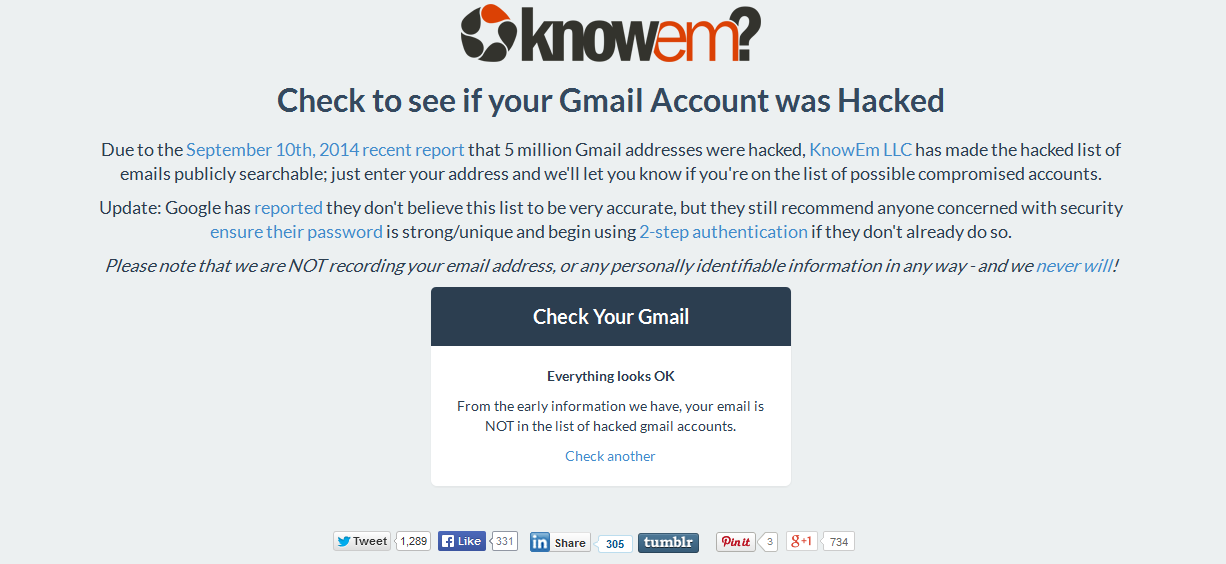 وفي ما يخص هذا الأمر قامت شركة knowem المشهورة بتضمينها لقائمات للحسابات المخترقة من مختلف الخدمات و الشبكات الاجتماعية بإطلاق صفحة خاصة بالاختراق الأخير، حيث بإمكان المستخدمين التحقق من ما إذا كان حسابهم هل اخترق أو لا، الشيء الذي يغنيك عن البحث في الأعداد الضخمة من الحسابات المسربة و المنتشرة بالنت هذه الأيام.أولا ستحتاج ولوج صفحة التأكد عبر الرابط أسفل التدوينة ثم كتابة عنوان بريد الجيميل .