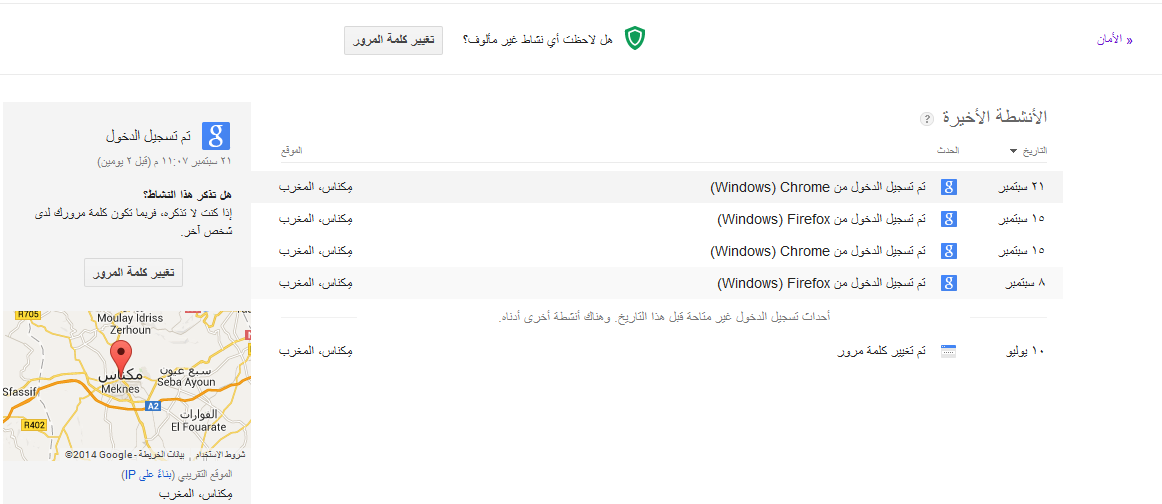 ملحوضة : لا تزال قائمة ببيانات الموقع في تحديث مستمر بالتعاون مع شركة غوغل لتضمين جميع الإيميلات التي تنشر على النت، و لمزيد من التأكد من أن حسابك لم يتم اختراقه يمكنك ولوج الرابط التالي و التأكد من أن أحدا لم يلج حسابك من بلد أو مدينة أخرى كما هو مبين في الصورة .