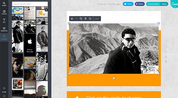 هو تطبيق جديد شيء ما على الانترنت ، وهو ما يزال في الفترة التجريبية .هذا التطبيق يتوفر على لآلاف من عناصر التصميم الرائعة، بما في ذلك الصور، والمخططات، والخطوط.العديد من هذه العناصر هي مجانية ، الا أن بعضها تتطلب الدفع لتستخدمها في تصاميمك. بالطبع، يمكنك استخدام صور الخاص من الفيس بوك أو من رفعها مباشرة من جهازك .