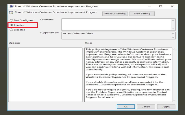 5- في الجزء العلوي على اليسار، حدد خيار Enabled لتعطيل هذه الميزة.