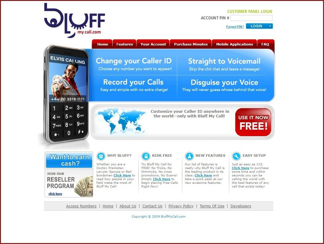 يقدم Bluff My Call ميزات خداع أساسية ، مثل هوية المتصل والمراسلة النصية ، بالإضافة إلى خدمات أكثر تقدمًا ، مثل محرر جهات الاتصال ، أو إمكانية أن يصبح شريكًا للشركة كموزع.