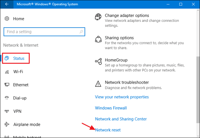 الحل الأول: أول طريقة ستقوم بالاعتماد عليها وهي ذات فعالية كبيرة جداً هي عن طريق إعادة تعيين للإنترنت على حاسوبك وكما قلت فهي تم إطلاقها في التحديثات الأخيرة من ويندوز 10 لهذا الغرض وحتى تقوم بعمل Network Reset للإنترنت ما عليك سوى التوجه للإعدادات عن طريق النقر فوق win+I ثم تختار statue ثم Network Reset على هذا الشكل: