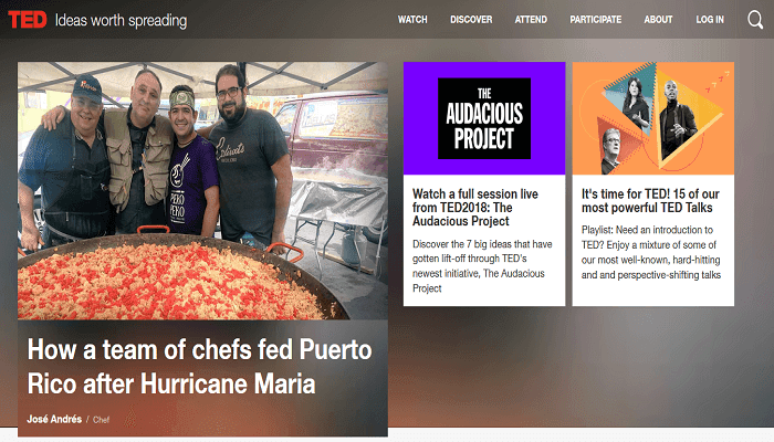 TED هو إختصار لعبارة (التكنولوجيا والترفيه والتصميم) هي مؤسسة إعلامية تنشر المحادثات عبر الإنترنت للتوزيع المجاني ، تحت شعار “أفكار تستحق الانتشار، في البداية كان التركيز لـ TED هو التكنولوجيا والتصميم ، بما يتوافق مع أصول وادي السليكون ، لكن لاحقاً وسع نطاق تركيزه ليشمل المحادثات حول العديد من المجالات العلمية والثقافية موضوعات أكاديمية.