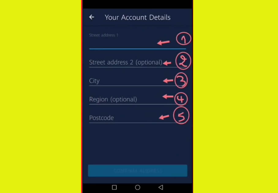 وتقوم بإضافة المعلومات مثل العنوان الكامل والرمز البريدي  وفي الخانة الثانية قم بزياد ة باقية العنوان مع الرمز البريدي . وفي خانة Region سوف تقوم بإضافة البلد الخاص بك . وكذلك في خانة Postecode  أكتبه كهذا المثال إذا كان هكذا 15055 عليك كتابته متفرق علي هذا الشكل 55 150