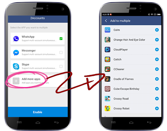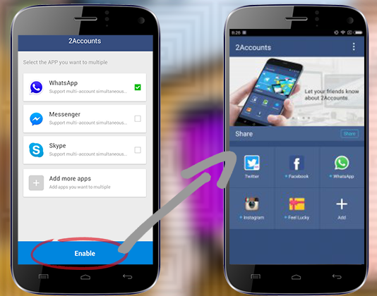 الآن بعد إختيار التطبيق الذي تود مضاعفته في هاتفك و إنشاء أكثر من حساب فيه , قم بالضغط على أيقونة Enable , لتنتقل بعدها إلى واجهة اخرى يمكنك من خلالها إنشاء أو إظافة أكتر من حساب في ذالك التطبيق الذي إخترته , و بعدها مباشر ستلاحظ ان الأيقونة الخاص بهذا التطبيق الذي إخترته تمت مضاعفته , بحيت أن الأيقونة الخاصة به تم مضاعفته أكثر من مرة و بالتلي يمكن الدخول إلى جميع الحسابات التي أنشات عن طريق الأيقونات المضاعقة التي تم توليدها !