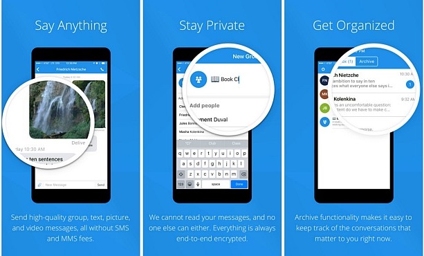 هو أيضا من التطبيقات الشهيرة و يعرف معظمكم ، لكن هو الأخر من التطبيقات التي تأخذ مسألة الخصوصية بشكل جاد للغاية فهو يمنع وصول معلوماتك أو رسائلك لأي طرف ثالث كما يمكنك من تشفير الرسائل ، بإضافة إلى هذا فهو سريع و مجاني و خال من الإعلانات