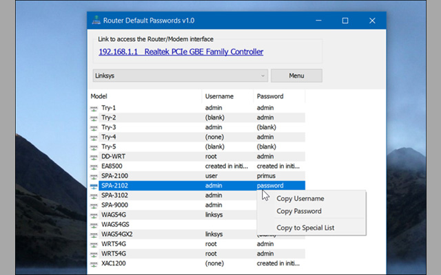 هذا البرنامج يقوم بتقديم أداة رائعة ومفيدة إذا كنت ترغب في تغيير بعض إعدادات الرواتر ولكن لا تعرف تحديد اسم المستخدم وكلمة المرور الذان يستخدمان في عملية تسجيل الدخول إلى صفحة الإعدادات، كل ما عليك هو فتح هذا البرنامج وقم بتحديد الرواتر من القائمة وسوف يعرض لك كلمة السر واسم المستخدم المخصصين من أجل الدخول إلى صفحة الإعدادات الخاصة بالراوتر وهذا على حسب الموديل، وبعد ذلك تستطيع بكل سهولة نسخ البيانات من خلال الضغط كليك يمين على القائمة وكما نلاحظ في الصورة التي توجد بالأعلى أنه يقوم بإستعراض عنوان ال ip الخاص بالراوتر والذي سوف تقوم بكتابته في شريط عنوان المتصفح وذلك من أجل تحويلك على صفحة إعدادات الراوتر.