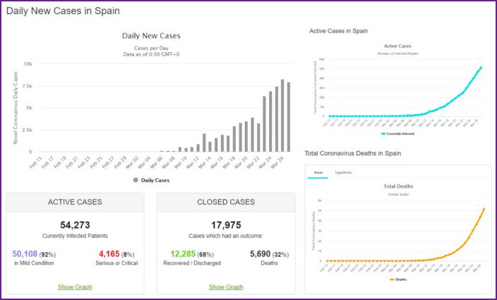 من المحتمل أن  يكون هذا الموقع أفضل مصدر للمعلومات لمواكبة عدد المصابين والوفيات والحالات التي تعافت . فهو لا يقدم فقط كمية كبيرة من المعلومات ويحافظ على تحديثها عمليًا في كل مرة ندخل إلى الموقع ، ولكن يمكننا أيضًا العثور على بعض الرسوم البيانية المثيرة للاهتمام .