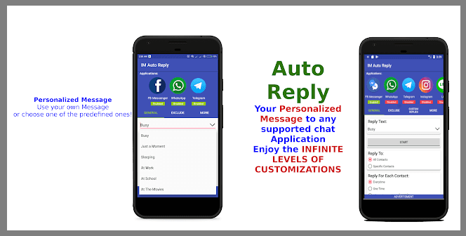 يتم استعمال هذا التطبيق للإجابة بشكل أوتوماتيكي على خدمات الرسائل الفورية التي تدخل فيها كل من تطبيقات الواتساب، فيسبوك، ماسنجر، تيليغرام، والعديد من التطبيقات الأخرى التي يمكنك تخصيصها حسب اختيارك، كما أنه فور وصول تنبيهات التطبيقات السابقة الذكر يقوم هذا التطبيق بالإجابة بشكل أوتوماتيكي حسب الرسائل المخصصة.