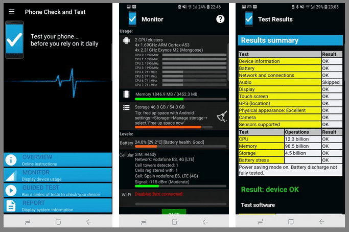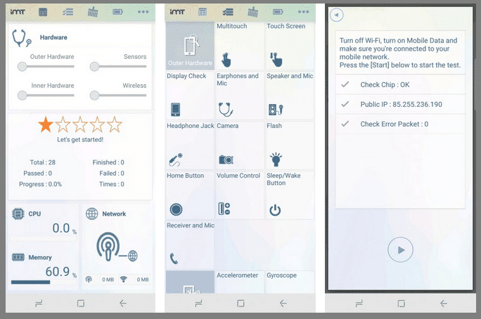 يمكنك استعمال التطبيق التالي لفحص هاتفك الأندرويد بشكل دقيق والذي يستغرق منك وقت طويل لفحص الهاتف ومعرفة الأعطال والمشاكل التي من الممكن أن تواجه هاتفك الأندرويد، كما يوفر لك أيضاً ميزة التوفر على 30 اختبار لفحص أي شيئ موجود في الهاتف مثل الكاميرا، الصوت، الصورة والعديد من الأشياء الأخرى.