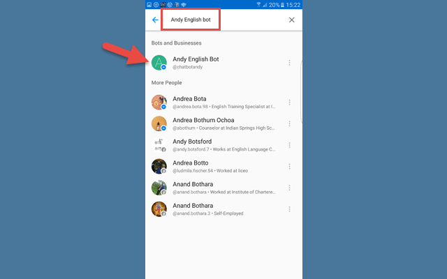 هذا البوت المميز والأخرى التي سنذكرها في هذه التدوينة تستطيع إظهارها فقط من خلال الدخول إلى تطبيق الماسنجر والبحث ضمن شريط البحث داخل التطبيق عن اسم البوت ، مثال Andy English Bot