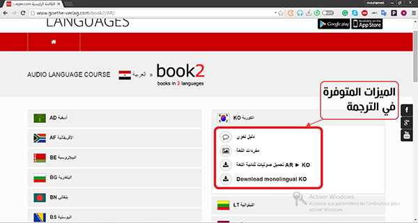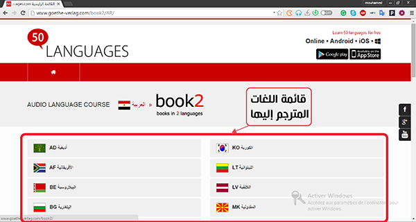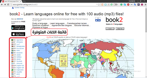 ندخل إلى الموقع نجد على اليسار قائمة للغات المتاحة ، و ننقر على اللغة المراد تعلمها .