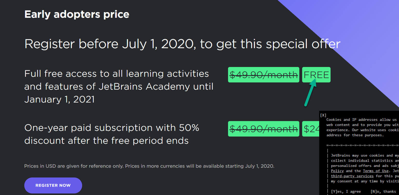 تشتهر دورات برمجة JetBrains بجودتها. إنها منصة بتكلفة تصل إلى 50 دولارًا تقريبًا في الشهر ، لكنهم افتتحوا للتو عرضًا ترويجيًا ليتمكنوا من إجراء الدورات مجانًا.