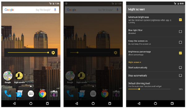 عن طريق هذا التطبيق تستطيع ضبط سطوع الشاشة إلى مستويات أقل مما هو متوفر في الإعدادات الافتراضية للهاتف.كما يمكنك إضافة فلاتر مريحة للعين ويوفر أربع أوضاع ليلية مختلفة لتحمي عينيك .