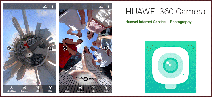 تعد هواوي علامة تجارية شهيرة موثقة للهاتف والالكترونيات، يرصد هذا التطبيق كاميرا هواوي بزاوية 360 درجة وتحتاج إلى إضافة الكاميرا إلى الهاتف الذي تم تثبيت التطبيق عليه لاستخدام هذا التطبيق بالفعل هذا خيار رائع إذا كنت ترغب في شراء هاتف هواوي، ويمكنك مشاركة هذه الصور لتظهر جودة عالية على وسائل التواصل الاجتماعي مثل Facebook و  Weibo .