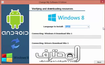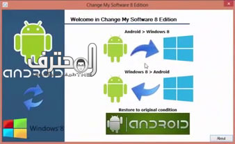 قم بربط هاتفك بحاسوبك باستعمال وصلة usb و افتح برنامج Change My software اختر Android ثم Windows 8 كما في الصورة: