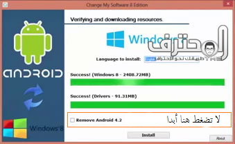 بعد اكتمال التحميل قم بالضغط على Install للتثبيت لكن لا تقم باختيار Remove Android لكي تحتفظ بنظامك أندرويد على هاتفك