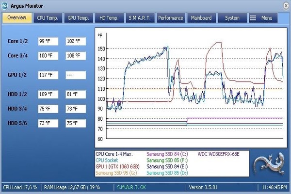 وللإشارة، ففي حالة تعرضت إحدى مكونات حاسوب إلى مشاكل مثل ارتفاع قصوي في درجة الحرارة أو مشاكل تقنية أخرى، فبرنامج Argus Monitor سيقوم بإظهار تحذير من إحتمال إتلاف القطعة وبالتالي تأثيرها على الحاسوب بأكمله وبالتالي يستوجب على المستخدم إتخاد التدابير اللازمة سواء في تغيير القطعة أو إصلاحها.