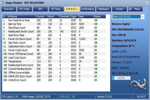 على مستوى خيار S.M.A.R.T يمكنك الإطلاع على حالة القرص الصلب بالتفصيل وذلك بمعرفة درجة حرارته وأيضا حالته التقنية مثل أداءة أثناء عملية القراءة والكتابة، وأيضا عدد الساعات التي اشتغلها والعديد من الخصائص الأخرى. أما على يمين النافذة ستجد بعض المعلومات المتعلقة بالقرص الصلب المستعمل على حاسوبك مثل الشركة المصنعة والمساحة التخزينية وصنفه إلى آخره.