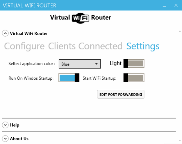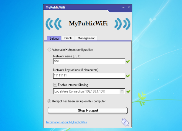 خيار اخر سهل الاستخدام لتحويل حاسوبك إلى نقطة وصول لاسلكية عبر الواي فاي.خلافا للبرامج السابقة يوفرMyPublicWiFi بعض الخيارات التي لا توجد في غيرها من البرامج مثل جدار الحماية لمنع استخدام برامج P2P ،كما يمكنك استخدامها ل تقييد وصول المستخدم إلى بعض خدمات الإنترنت معينة.أيضا، يمكنك اعداده ليبدأ مع ويندوز كما أنه يعرض معلومات حول الأجهزة المتصلة.