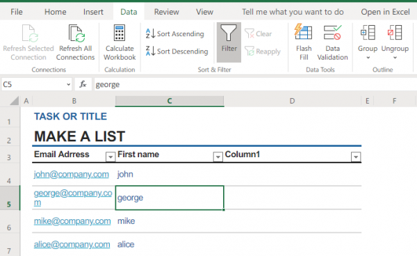 بنفس الطريقة ، يمكنك تعبئة الفلاش لدمج البيانات. على سبيل المثال ، إذا كان لديك عناوين بريد إلكتروني في العمود الأول ، فيمكنك استخدام Flash fill لإنشاء العمود الأول عن طريق إدخال نمط البريد الإلكتروني الصحيح والاسم الأول في العمود الثاني. بكلمات بسيطة ، إذا كنت تريد استخراج البيانات أو دمجها ، فما عليك سوى النقر على Flash ، ثم املأ جلسة “أدوات البيانات” عن طريق كتابة النمط الذي تريده أن يعرضه.