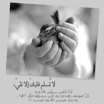 | لا تسلم قلبك إلا لتقي لأن التقي يتقي الله فيه كل العواطف زائفة! إلا تلك التي منشؤها الأول وأحترام مايرضي الله وما لا يرضيه |