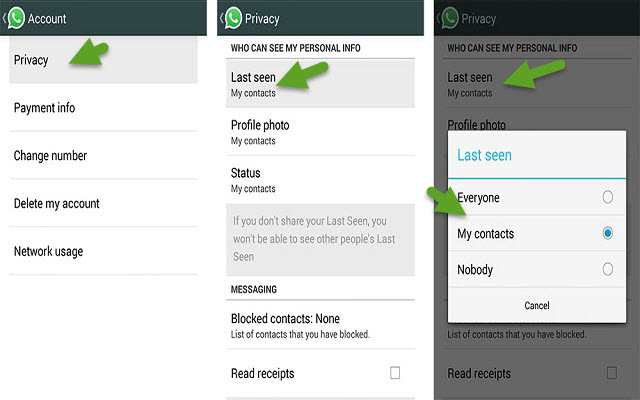يوجد على الواتساب خيار إخفاء ظهورك على أصدقاءك أو غير الأصدقاء ، ويمكن الوصول إليه عبر الضغط على خيارoptions ثم على الإعدادات settings ثم الضغط على الحساب account واختيار privacy أي الخصوصية ، و سوف تجد فيها خيار Last Seen ، بالضغط عليه سوف تظهر ثلاثة خيارات هي : الجميع Everyone ، جهات اتصالي My contacts ، لا أحد Nobody ، تختار ما يناسبك.