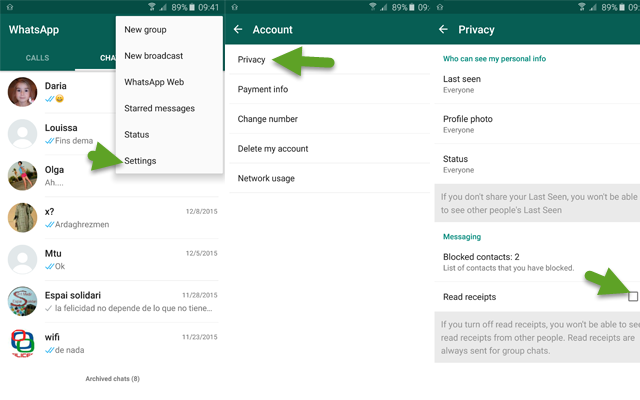بإمكانك إزالة ظهور العلامة الزرقاء التي تبين لصديقك أنك قمت بقراءة رسالته ، وذلك بالضغط على settings ثم account وبعد ذلك على privacy ، وتقوم بإزالة العلامة على خيار Read receipts