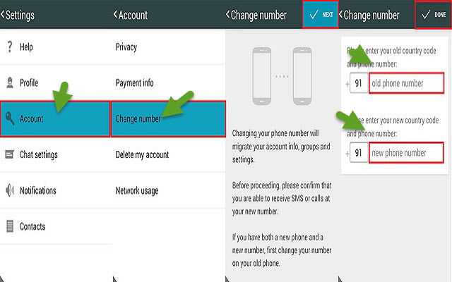 في حالة ما كنت تمتلك رقم جديد وتريد تبديل الرقم الحالي الخاص بك على الواتساب فتقوم بالذهاب إلى خيار options واختيار الإعدادات settings ثم الضغط على account وأخير الضغط على change number ثم تقوم بإدخال الرقم القديم والجديد .