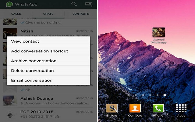 إذا كان لديك شخص عزيزعلى الواتساب وتحب دائما التواصل معه ، فبإمكانك إنشاء له اختصار على شاشة هاتفك ، وذلك بالضغط طويلا على إسمه ، وشتنبثق نافذة تختار فيها إضافة اختصار للمحادثة Add conversation shortcut وهكذا ستشاهد أيقونته على شاشة هاتفك .