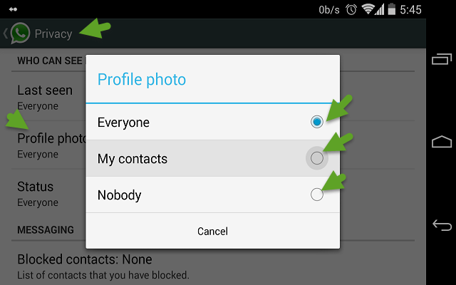 إذا كنت لا تريد أن يشاهد صورتك أي شخص على الوتساب فيمكنك إخفاءها على من تريد وذلك بالذهاب إلى خيار options والضغط على الإعدادات settings ثم الذهاب إلى الحساب account والضغط على الخصوصية privacy وستجد خيار صورة البروفايل Profile photo وبالضغط عليه ستجد : الجميع Everyone ، وجهات اتصالي My contacts ثم لا أحد Nobody ويمكنك اختيار ما يناسبك.