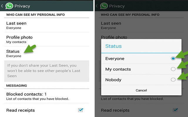 بإمكانك إخفاء الحالة التي تكتبها عادة على الواتساب ، وذلك بالذهاب إلى الخيارات options والضغط على الإعدادات settings ثم على الحساب account ، واختيار الخصوصية privacy ثم الضغط على الحالة Status ، وتختار في الأخير بين مشاركتها مع : الجميع Everyone ، أو جهات إتصالك My contacts ، أو لا أحد Nobody .