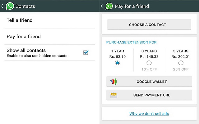 بإمكانك بعد سنة من الإستخدام دفع لصديقك مبلغ اشتراك الواتساب وذلك إذا كان لا يتوفر على بطاقة بنكية ، وذلك بالذهاب إلى قسم الإعدادات settings ثم الضغط على جهات الإتصال Contacts وسوف يظهر لك خيار الدفع لصديق Pay for a friend