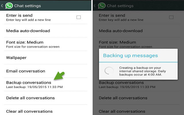 حتى تستطيع استعادة المحادثات بعد إزالة الواتساب و إعادة تثبيته في أي وقت ، فيلزمك عمل نسخة احتياطية لهذه المحادثات وذلك بالذهاب إلى options والضغط على الإعدادات settings ثم اختيارChat Settings وأخيرا تضغط على الضغط على النسخ الاحتياطي للمحادثات Backup conversations