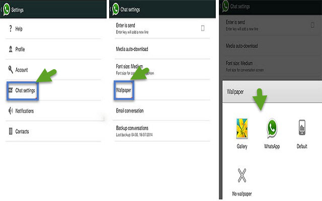 إذا كنت قد مللت الخلفية التقليدية لتطبيق الواتساب وتريد تغييرها فيمكن ذلك من خلال الذهاب إلى الإعدادات settings ثم الضغط على إعدادات الدردشة Chat Settings ثم اختيار Wallpaper وستقوم باختيار الصورة التي تريدها بنفسك كخلفية للدردشة .