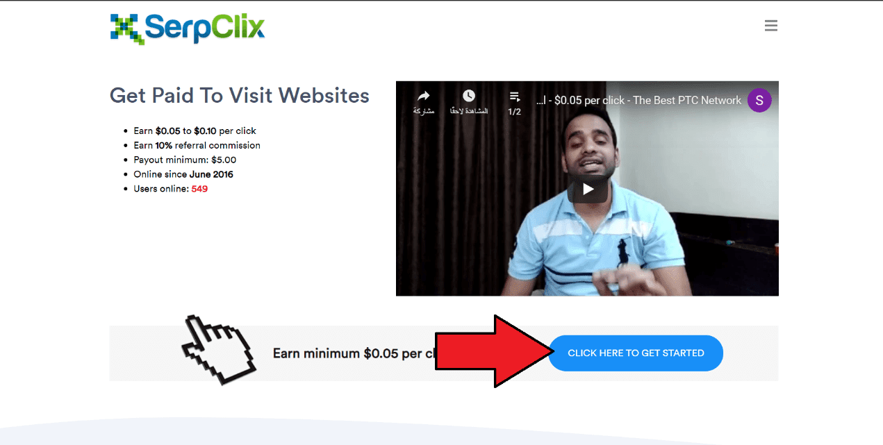 عند الدخول للموقع يقدم لك بعض التفاصيل كم سوف تربح لكل عملية بحث و الحد الادنى وهو 5$ نقوم بالنقر على click here لتسجل في الموقع وبدا العمل فيه سوف يفتح لك نافذة جديد نقوم بتسجيل البريد الإلكتروني وكلمة السر و بريد البايبال وسيلة السحب الوحيدة في الموقع