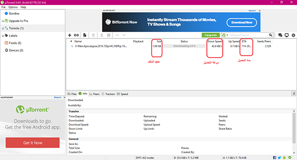 4/ الآن سأقوم باختيارملف تورنت ما ونرى سرعة تحميله قبل أن أستخدم البرنامج :