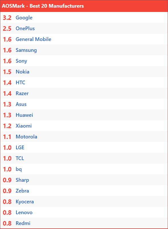 كما أنها تعطي درجة من 0 إلى 5 نقاط ، حيث 5 هي العلامة التجارية المثالية التي لديها جميع هواتفها في السوق محدثة إلى أحدث إصدار من أندرويد ، على الرغم من أن هذا يبدو مستحيلًا في مرحلة ما.