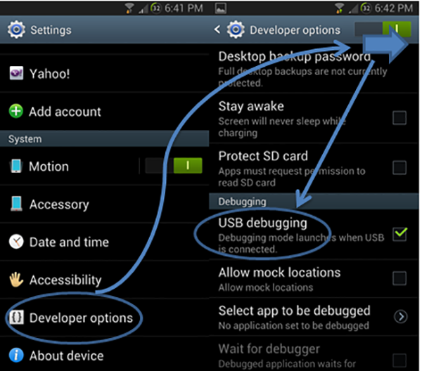 بعد ذلك نقوم بالذهاب الي الهاتف الدخول الي اعدادات المطورين واختيار USB debugging