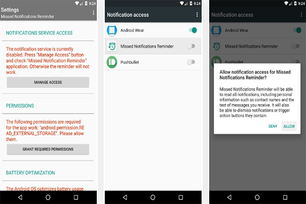 من أجل الحصول على هذه الخدمة يجب عليك تثبيت تطبيق يدعى ” Missed Notifications Reminder ” و الذي هو تطبيق مجاني سوف تجده بمتجر بلاي ستور كما أن رابط تحميل التطبيق سأبقيه أسفل التدوينة .. غير ذلك فبعد ولوجك إلى التطبيق يجب عليك تفعيل خيار الإشعارات من أجل السماح بظهور التطبيق على شاشة الجهاز و كذلك في قائمة الإشعارات كما هو مبين في الصورة