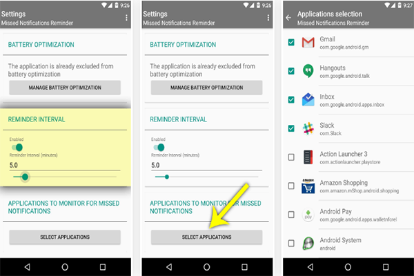 بعد تفعيل الخيار كل ما عليك فعله الأن هو التعليم على التطبيقات التي تود أن تتوصل بإشعار في حالة ما إذا لم تقرأ رسالة معينة أو شيئ كهذا .. كما أنه هنالك إعدادات متقدمة سوف تجد أيقونتها في الأعلى تمكنك من إختيار صوت الإشعار بنفسك و كذلك إمكانية تفعيل Vibrate و مجموعة من الخواص التي ستكتشفها بنفسك.