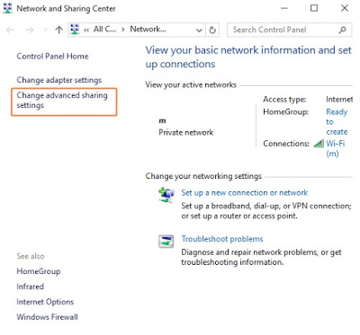 في نافذة مركز الشبكة والمشاركة، انقر على “تغيير إعدادات المشاركة المتقدمة” الموجودة على الجانب الأيمن.