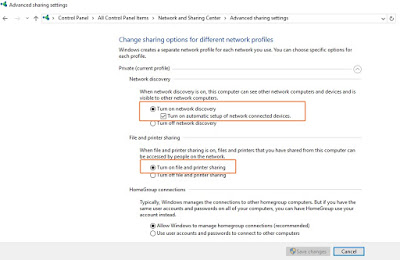 في إعدادات المشاركة المتقدمة، مكن “تشغيل اكتشاف الشبكة” و “تشغيل مشاركة الملفات والطابعات” ضمن الشبكة الخاصة (الملف الشخصي الحالي).
