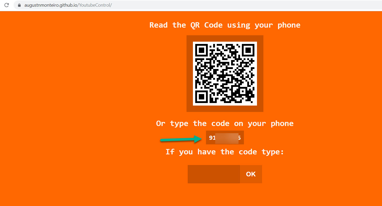 آلية استخدام YouTube Control بسيطة للغاية ، بالإضافة إلى أنه لا يتطلب التسجيل أو الدفع. للبدء ، تفضل بزيارة موقع الويب وستظهر لك على الفور شاشة برتقالية بجوار رمز QR ورمز أبجدي رقمي.