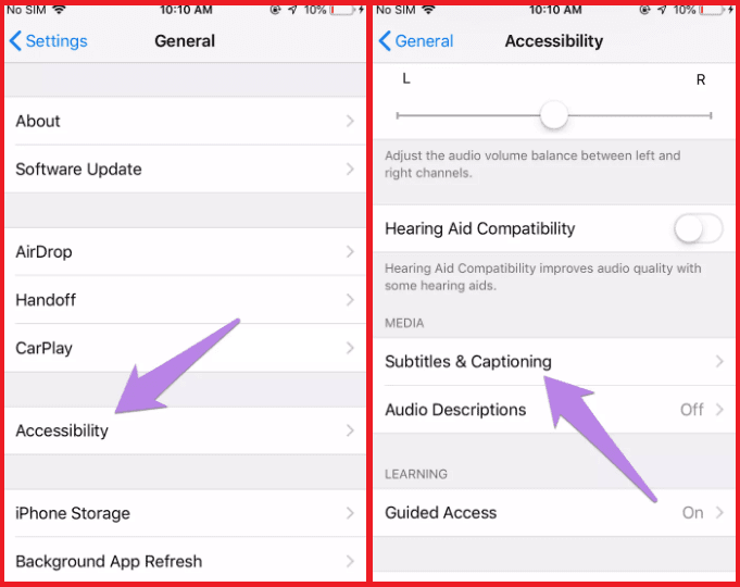 الخطوة 2: قم بالضغط على خيار Accessibility، وبعدها بالنزول الى الأسفل حدد Subtitles & Captioning.
