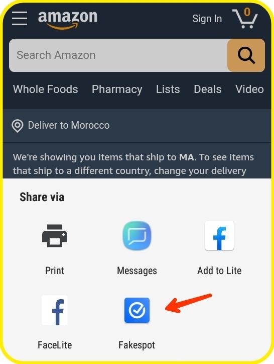 كل ما عليك فعله للتحقق من مصداقية المنتجات في متاجر التسوق المفضلة ، هو اختيار أحد هذه المنتجات ثم الضغط على خيار ” مشاركة ” و اختيار تطبيق Fakespot من القائمة كما في الصورة .
