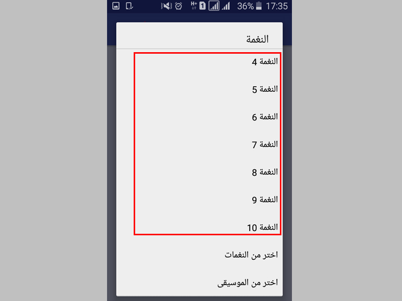 ثم تقوم بالضغط على خيار النغمة لاختيار صوت الذي يعجبك من الاصوات الموجودة