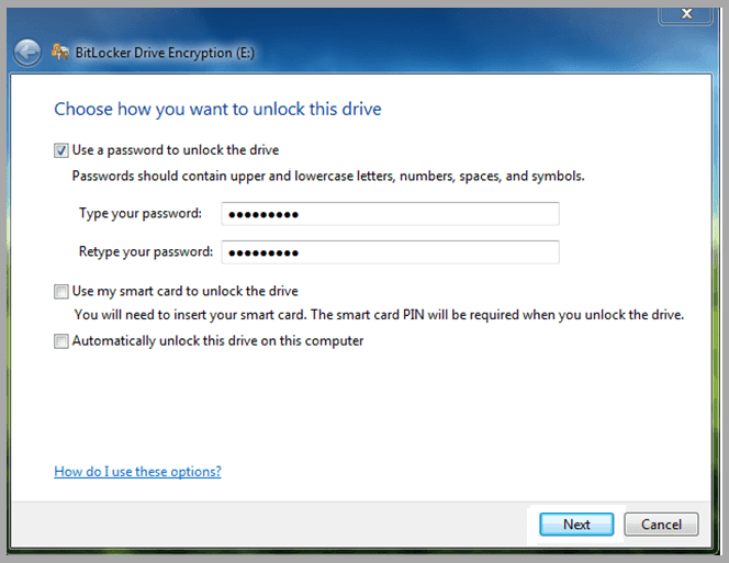 وفي الخطوات الموالية سيجب عليك اختيار كلمة سر خاصة بك للإدلال بها عندما تريد الدخول إلى أي قرص صلب أو جهاز تخزين آخر